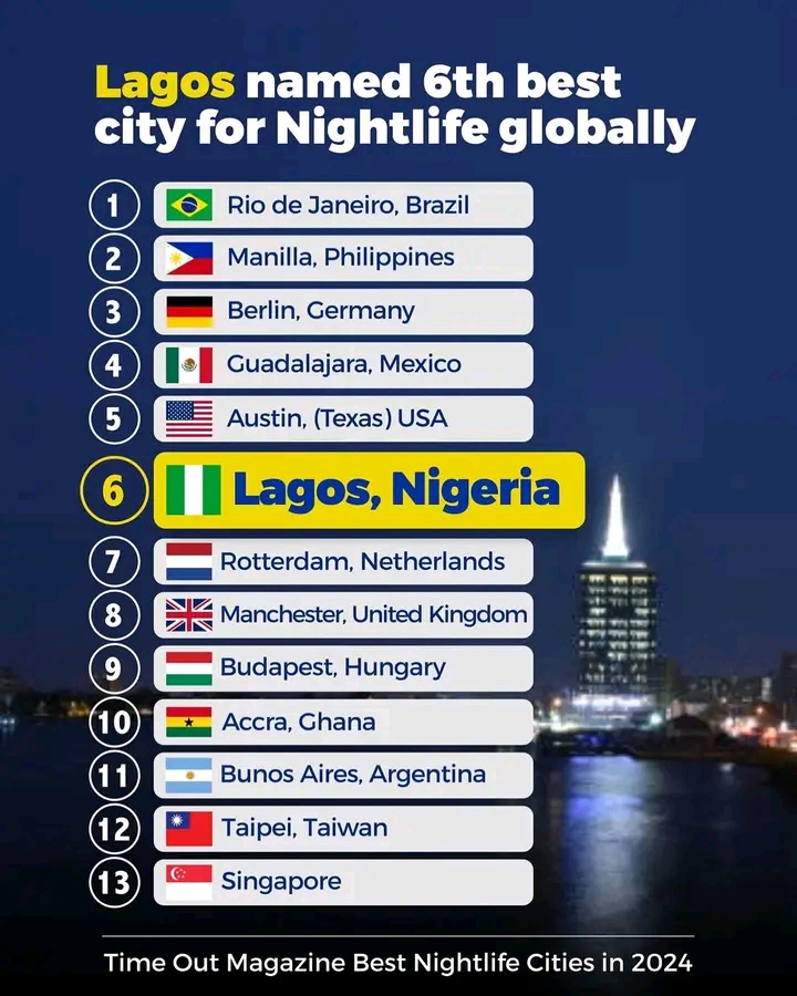 Lagos has been named 6th best city for nightlife in 2024 ahead of Rotterdam, Netherlands and Manchester, United Kingdom, amongst others. Only cities of Rio de Janeiro, Brazil, Manilla, Philippines, Berlin in Germany, Guadaljara, Mexico and Austin (Texas) in the United States are ahead of Lagos, Nigeria in the rating made public by Time Out Magazine.
