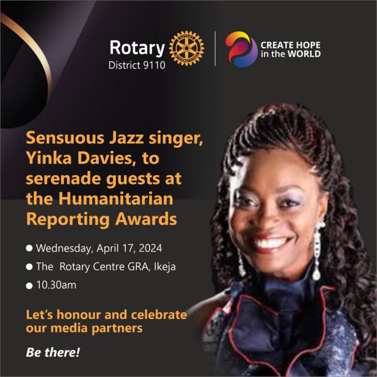 Sensuous Jazz singer, lyricist and vocalist, Yinka Davies is to perform and serenade guests at Rotary International District 9110 Humanitarian Reporting Awards (RHRA) on Wednesday, April 17, 2024 at Keystone Hall, Rotary Centre, 8 Ladoke Akintola Street, Ikeja GRA, Lagos.