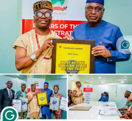 Barrister Ojo-Lanre made this commendation while presenting the award to the Governor and introducing two newly appointed tourism officials from Ekiti State, Mr. Peculiar Ekiran, the Special Assistant on Tourism Development, and Mrs. Dolapo Ogunleye, a Tourism Officer of the Bureau of Tourism Development, who were recently inducted into the prestigious Club 100 Tourism Personalities in Nigeria.